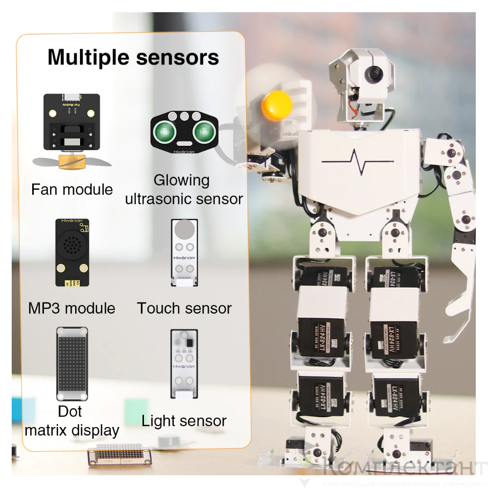 Андроидный робот Гуманоид разработан для изучения робототехнических устройств, шагающих механизмов и углубленного изучения языков программирования. Программирование осуществляется на языке Python.